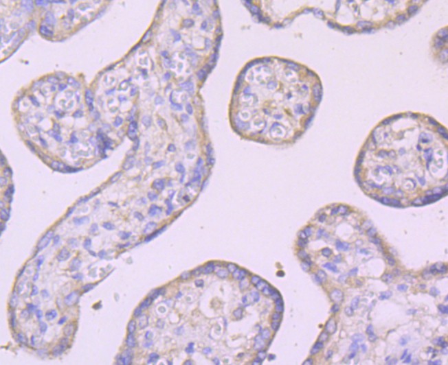 Immunohistochemical analysis of paraffin-embedded human placenta tissue using anti-IKK gamma antibody. The section was pre-treated using heat mediated antigen retrieval with Tris-EDTA buffer (pH 8.0-8.4) for 20 minutes.The tissues were blocked in 5% BSA for 30 minutes at room temperature, washed with ddH2O and PBS, and then probed with the primary antibody (bsm-54012R, 1/50) for 30 minutes at room temperature. The detection was performed using an HRP conjugated compact polymer system. DAB was used as the chromogen. Tissues were counterstained with hematoxylin and mounted with DPX.