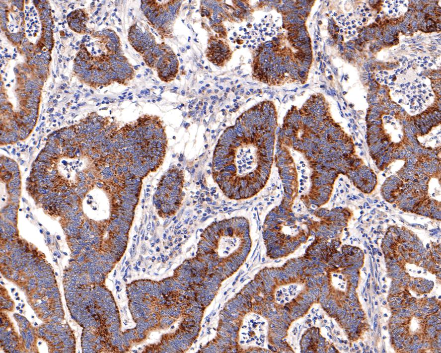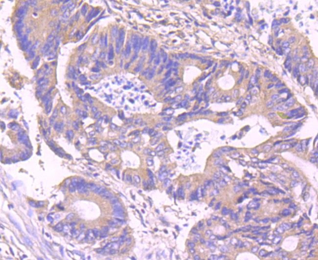 Immunohistochemical analysis of paraffin-embedded human colon carcinoma tissue with Rabbit anti-IKK gamma antibody (bsm-54012R) at 1/400 dilution.