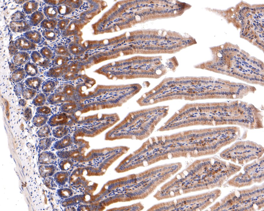 Immunohistochemical analysis of paraffin-embedded mouse colon tissue with Rabbit anti-IKK gamma antibody (bsm-54012R) at 1/400 dilution.