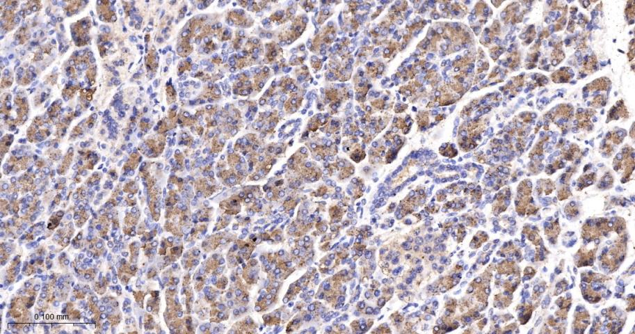 Paraformaldehyde-fixed, paraffin embedded Human Pancreas; Antigen retrieval by boiling in sodium citrate buffer (pH6.0) for 15 min; The section was incubated with DUSP6 Monoclonal Antibody, Unconjugated (bsm-52270R) at 1:200 overnight at 4°C, followed by conjugation to the bs-0295G-HRP and DAB (C-0010) staining.