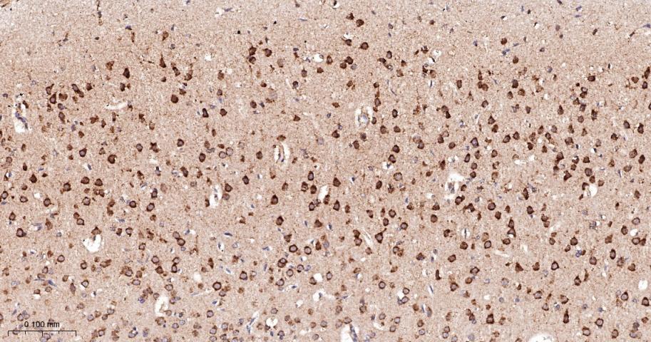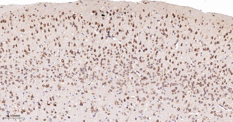 Paraformaldehyde-fixed, paraffin embedded Rat Cerebrum; Antigen retrieval by boiling in sodium citrate buffer (pH6.0) for 15 min; The section was incubated with DUSP6 Monoclonal Antibody, Unconjugated (bsm-52270R) at 1:200 overnight at 4°C, followed by conjugation to the bs-0295G-HRP and DAB (C-0010) staining.