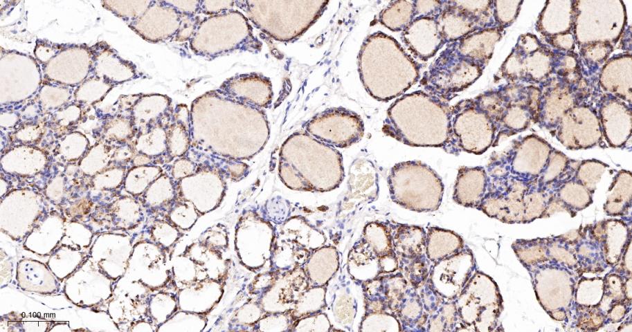 Paraformaldehyde-fixed, paraffin embedded Rat Thyroid Gland; Antigen retrieval by boiling in sodium citrate buffer (pH6.0) for 15 min; The section was incubated with DUSP6 Monoclonal Antibody, Unconjugated (bsm-52270R) at 1:200 overnight at 4°C, followed by conjugation to the bs-0295G-HRP and DAB (C-0010) staining.