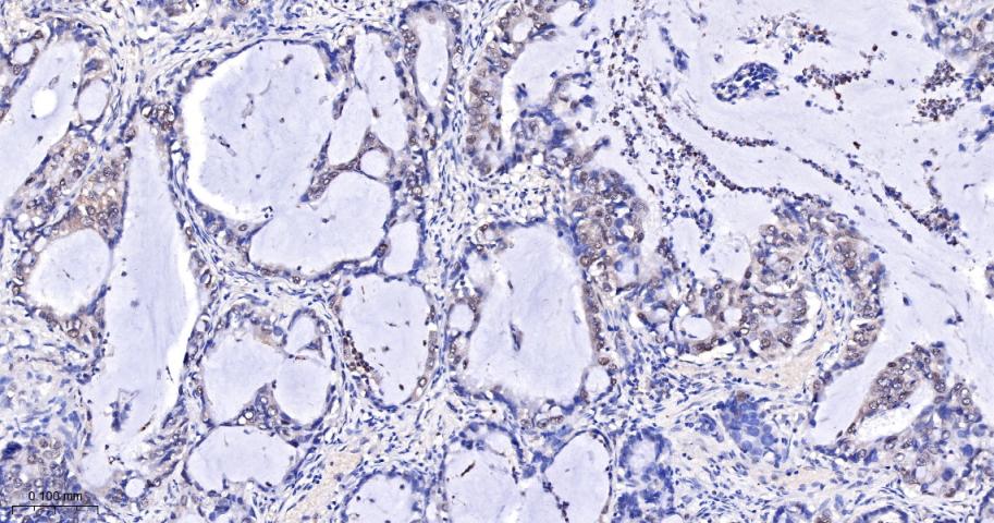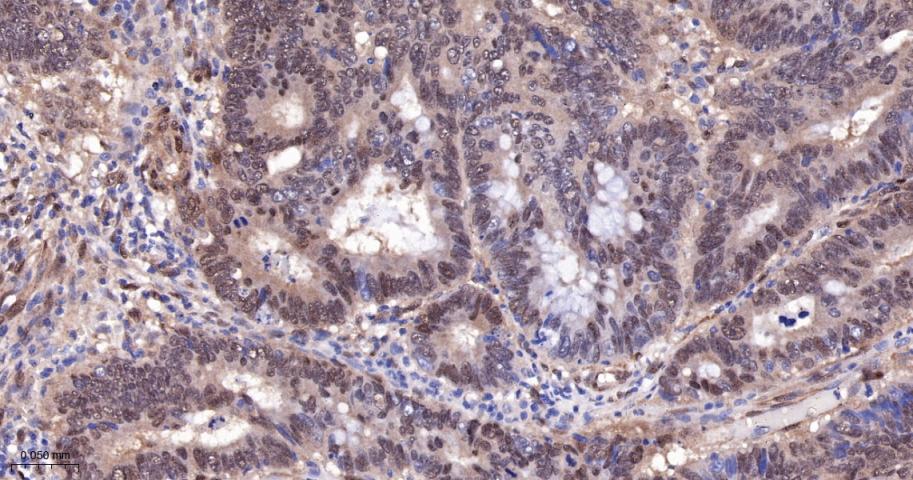 Paraformaldehyde-fixed, paraffin embedded Human Colon Cancer; Antigen retrieval by boiling in sodium citrate buffer (pH6.0) for 15 min; Antibody incubation with YAP1 Monoclonal Antibody, Unconjugated(bsm-52418R) at 1:200 overnight at 4°C, followed by conjugation to the SP Kit(Rabbit, SP-0023) and DAB (C-0010) staining.