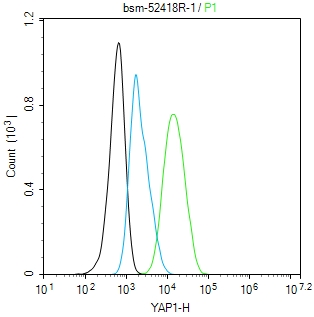 The Hela (H) cells were fixed with 4% PFA (10 min at r.t.) and then permeabilized with 90% ice-cold methanol for 20 min at -20℃,the cells then were incubated in 5%BSA to block non-specific protein-protein interactions (30 min at r.t.).Primary Antibody (green):Rabbit Anti-YAP1 antibody (bsm-52418R): 1 μg/10^6 cells; Secondary Antibody (white blue): Goat anti-Rabbit IgG-BF488 (bs-60295G-BF488): 1 μg/test.Blank control (black): PBS. Acquisition of 20,000 events was performed.