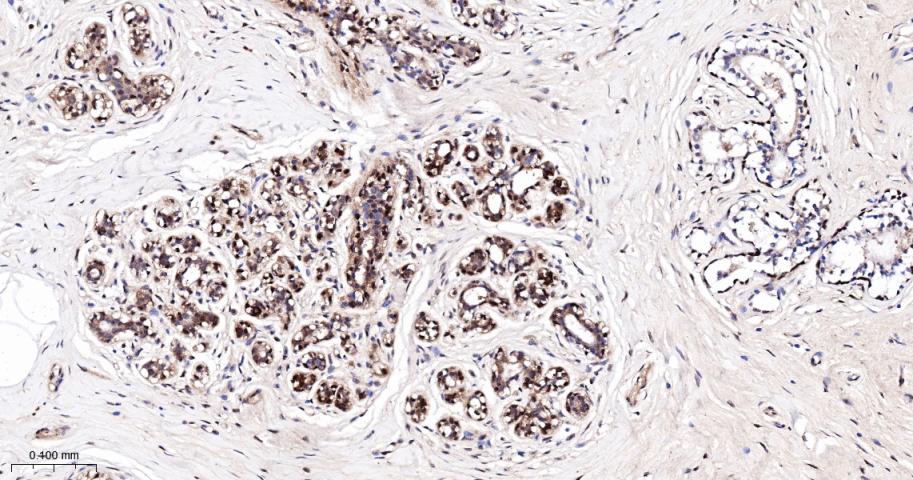 Paraformaldehyde-fixed, paraffin embedded Human Breast Cancer; Antigen retrieval by boiling in sodium citrate buffer (pH6.0) for 15 min; The section was incubated with YAP1 Monoclonal Antibody, Unconjugated (bsm-52418R) at 1:200 overnight at 4°C, followed by conjugation to the bs-0295G-HRP and DAB (C-0010) staining.