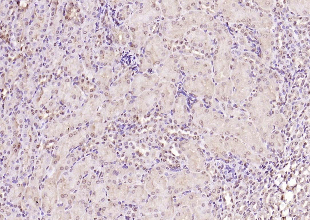 Paraformaldehyde-fixed, paraffin embedded (mouse kidney); Antigen retrieval by boiling in sodium citrate buffer (pH6.0) for 15min; Block endogenous peroxidase by 3% hydrogen peroxide for 20 minutes; Blocking buffer (normal goat serum) at 37°C for 30min; Antibody incubation with (PPM1D) Polyclonal Antibody, Unconjugated (bs-22939R) at 1:200 overnight at 4°C, followed by operating according to SP Kit(Rabbit) (sp-0023) instructionsand DAB staining.