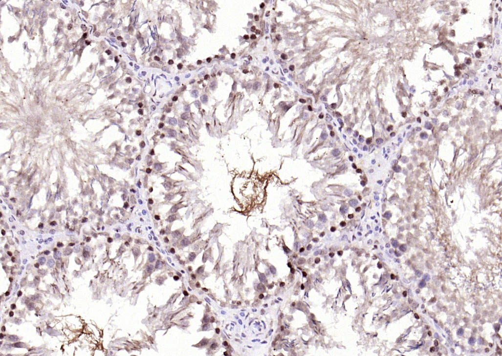 Paraformaldehyde-fixed, paraffin embedded (rat testis); Antigen retrieval by boiling in sodium citrate buffer (pH6.0) for 15min; Block endogenous peroxidase by 3% hydrogen peroxide for 20 minutes; Blocking buffer (normal goat serum) at 37°C for 30min; Antibody incubation with (PPM1D) Polyclonal Antibody, Unconjugated (bs-22939R) at 1:200 overnight at 4°C, followed by operating according to SP Kit(Rabbit) (sp-0023) instructionsand DAB staining.
