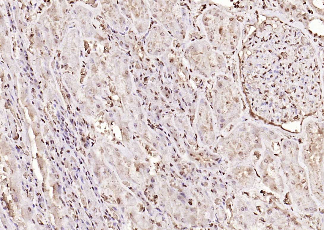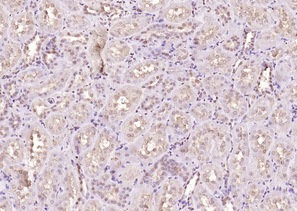 Paraformaldehyde-fixed, paraffin embedded (Human kidney); Antigen retrieval by boiling in sodium citrate buffer (pH6.0) for 15min; Block endogenous peroxidase by 3% hydrogen peroxide for 20 minutes; Blocking buffer (normal goat serum) at 37°C for 30min; Antibody incubation with (PPM1D) Polyclonal Antibody, Unconjugated (bs-22939R) at 1:200 overnight at 4°C, followed by operating according to SP Kit(Rabbit) (sp-0023) instructionsand DAB staining.