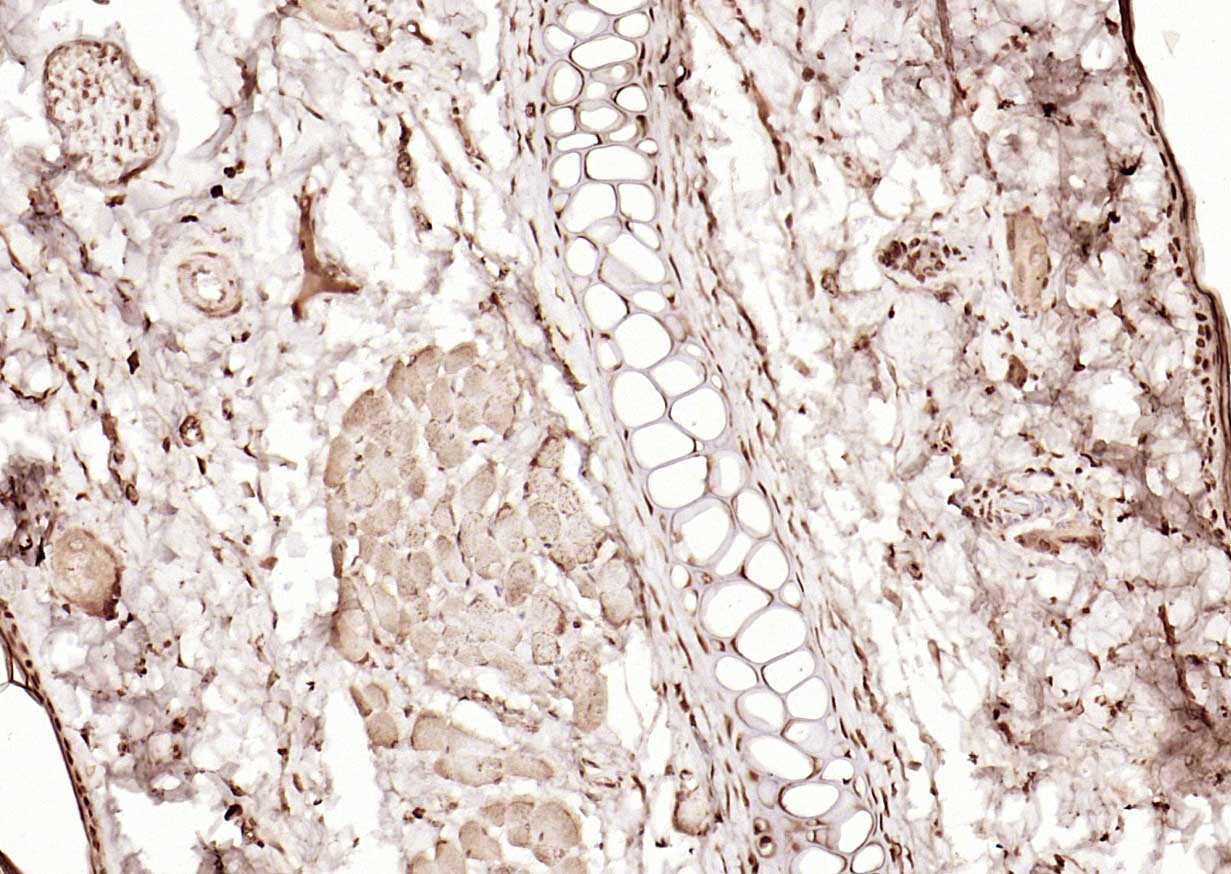 Paraformaldehyde-fixed, paraffin embedded (rat skin); Antigen retrieval by boiling in sodium citrate buffer (pH6.0) for 15min; Block endogenous peroxidase by 3% hydrogen peroxide for 20 minutes; Blocking buffer (normal goat serum) at 37°C for 30min; Antibody incubation with (PPM1D) Polyclonal Antibody, Unconjugated (bs-22939R) at 1:200 overnight at 4°C, followed by operating according to SP Kit(Rabbit) (sp-0023) instructionsand DAB staining.