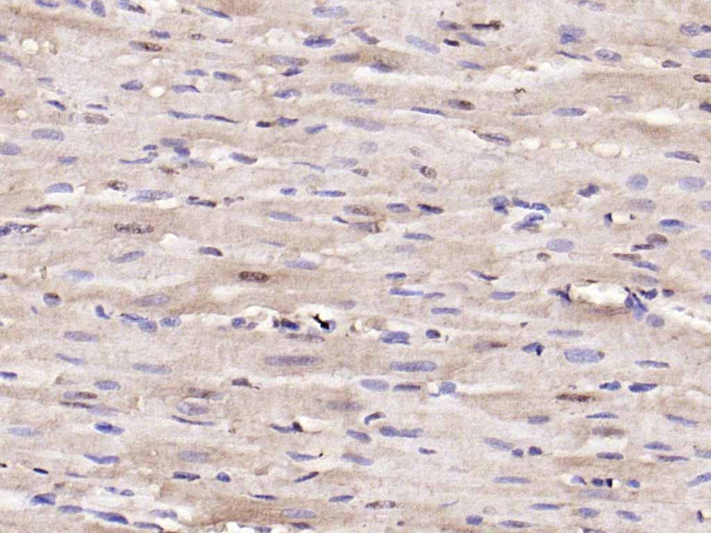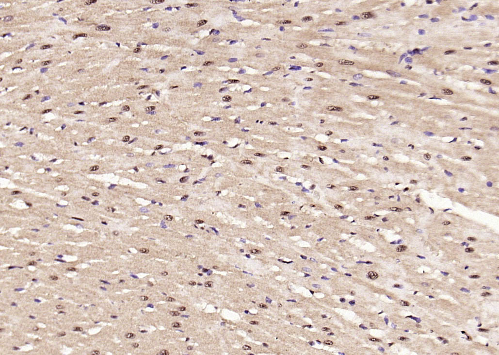 Paraformaldehyde-fixed, paraffin embedded (rat heart); Antigen retrieval by boiling in sodium citrate buffer (pH6.0) for 15min; Block endogenous peroxidase by 3% hydrogen peroxide for 20 minutes; Blocking buffer (normal goat serum) at 37°C for 30min; Antibody incubation with (TNMD) Polyclonal Antibody, Unconjugated (bs-41215R) at 1:200 overnight at 4°C, followed by operating according to SP Kit(Rabbit) (sp-0023) instructionsand DAB staining.