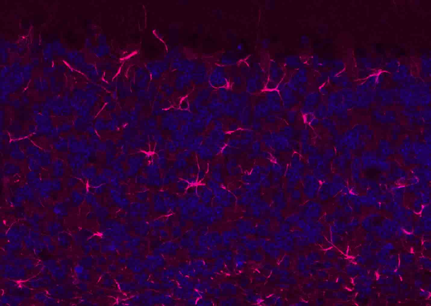 Paraformaldehyde-fixed, paraffin embedded (mouse cerebellum); Antigen retrieval by boiling in sodium citrate buffer (pH6.0) for 15min; Blocking buffer (normal goat serum) at 37°C for 30min; Antibody incubation with (GFAP) Polyclonal Antibody, Unconjugated (bs-0199R) at 1:200 overnight at 4°C, followed by a conjugated Rabbit IgG H&L / AF594 antibody (bs-0295D-BF594) for 90 minutes, and DAPI for nuclei staining.