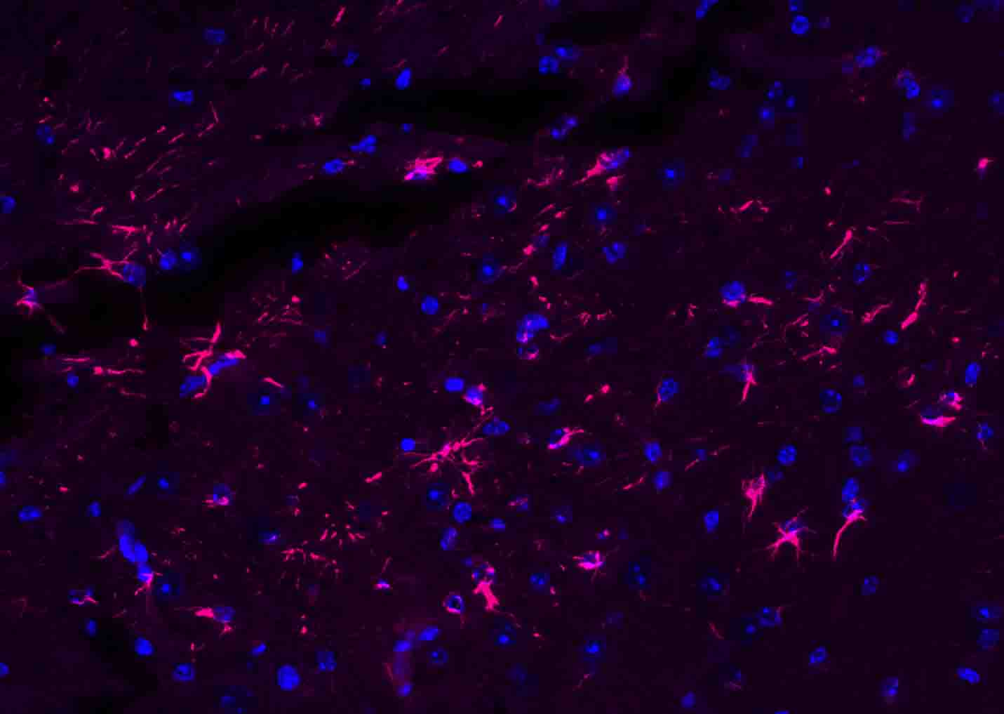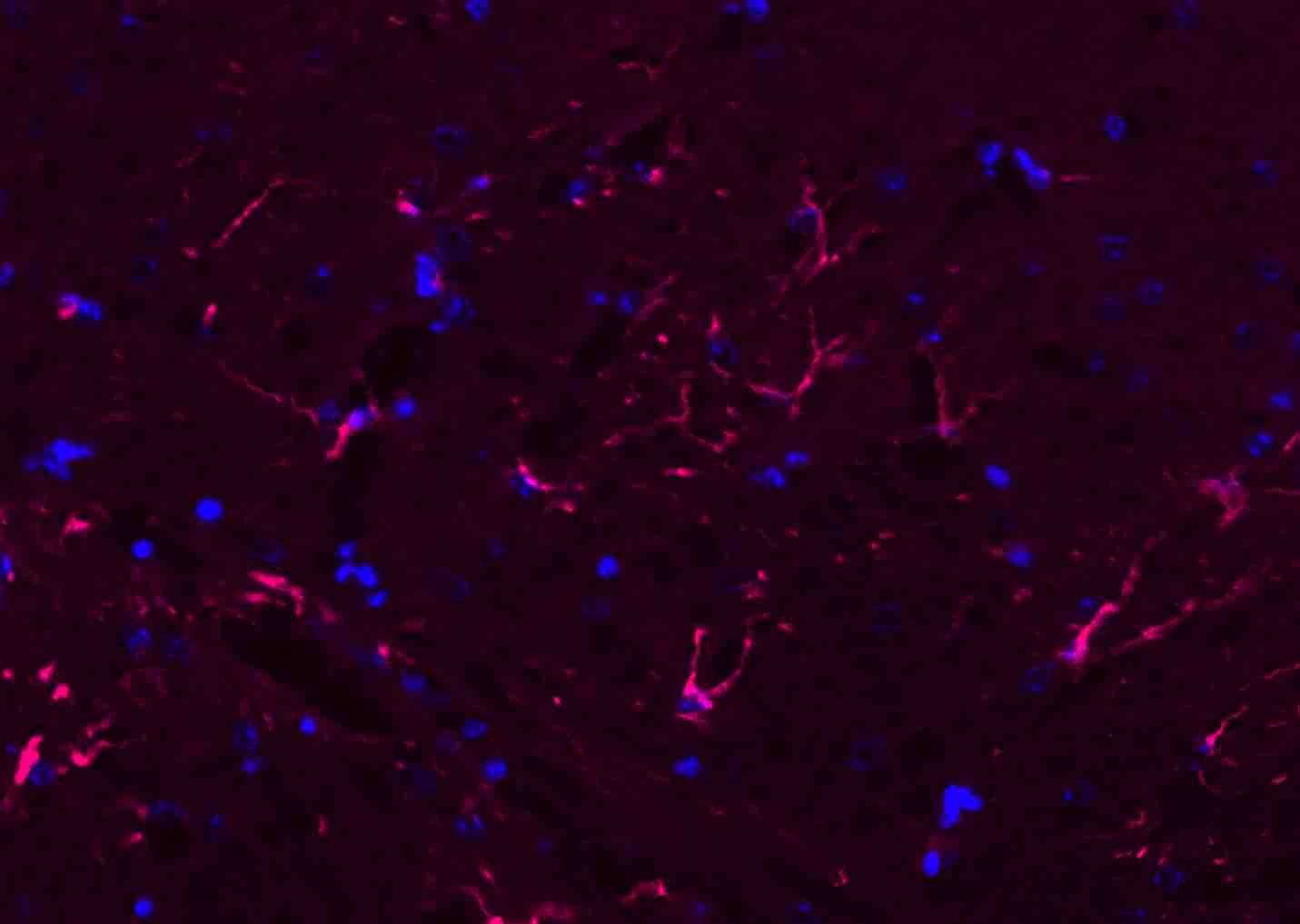 Paraformaldehyde-fixed, paraffin embedded (mouse brain); Antigen retrieval by boiling in sodium citrate buffer (pH6.0) for 15min; Blocking buffer (normal goat serum) at 37°C for 30min; Antibody incubation with (GFAP) Polyclonal Antibody, Unconjugated (bs-0199R) at 1:200 overnight at 4°C, followed by a conjugated Rabbit IgG H&L / AF594 antibody (bs-0295D-BF594) for 90 minutes, and DAPI for nuclei staining.