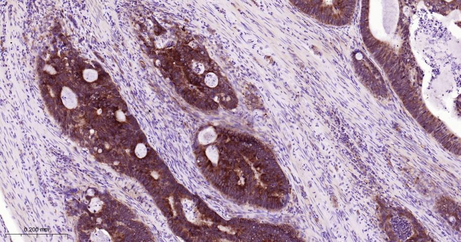 Paraformaldehyde-fixed, paraffin embedded Human Colon Cancer; Antigen retrieval by boiling in sodium citrate buffer (pH6.0) for 15 min; The section was incubated with TNFR2 Monoclonal Antibody, Unconjugated (bsm-52938R) at 1:200 overnight at 4°C, followed by conjugation to the bs-0295G-HRP and DAB (C-0010) staining.