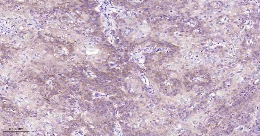 Paraformaldehyde-fixed, paraffin embedded Human Kidney Cancer; Antigen retrieval by boiling in sodium citrate buffer (pH6.0) for 15 min; The section was incubated with TNFR2 Monoclonal Antibody, Unconjugated (bsm-52938R) at 1:200 overnight at 4°C, followed by conjugation to the bs-0295G-HRP and DAB (C-0010) staining.