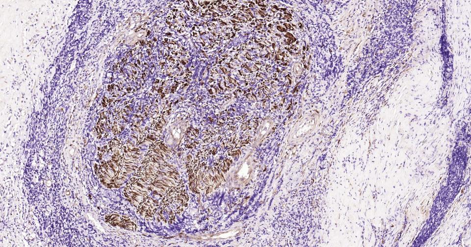Paraformaldehyde-fixed, paraffin embedded Human Thyroid Tumor; Antigen retrieval by boiling in sodium citrate buffer (pH6.0) for 15 min; Antibody incubation with Tubulin beta-III Monoclonal Antibody, Unconjugated(bsm-52323R) at 1:200 overnight at 4°C, followed by conjugation to the SP Kit (Rabbit, SP-0023)and DAB (C-0010) staining.