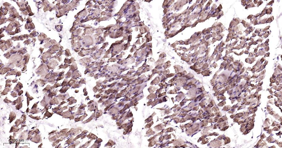Paraformaldehyde-fixed, paraffin embedded Human Skeletal muscle; Antigen retrieval by boiling in sodium citrate buffer (pH6.0) for 15 min; Antibody incubation with SOD2 Monoclonal Antibody, Unconjugated(bsm-52741R) at 1:200 overnight at 4°C, followed by conjugation to the bs-0295G-HRP and DAB (C-0010) staining.