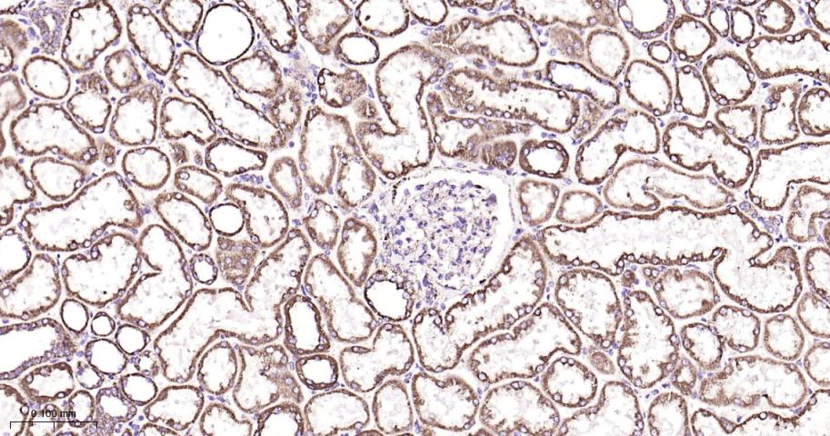 Paraformaldehyde-fixed, paraffin embedded Mouse Kidney; Antigen retrieval by boiling in sodium citrate buffer (pH6.0) for 15 min; Antibody incubation with SOD2 Monoclonal Antibody, Unconjugated(bsm-52741R) at 1:200 overnight at 4°C, followed by conjugation to the bs-0295G-HRP and DAB (C-0010) staining.