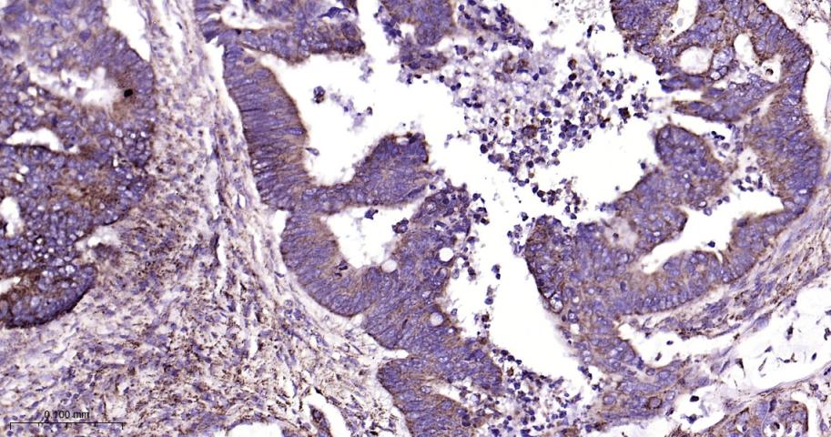 Paraformaldehyde-fixed, paraffin embedded Human Colon Cancer; Antigen retrieval by boiling in sodium citrate buffer (pH6.0) for 15 min; Antibody incubation with SOD2 Monoclonal Antibody, Unconjugated(bsm-52741R) at 1:200 overnight at 4°C, followed by conjugation to the bs-0295G-HRP and DAB (C-0010) staining.