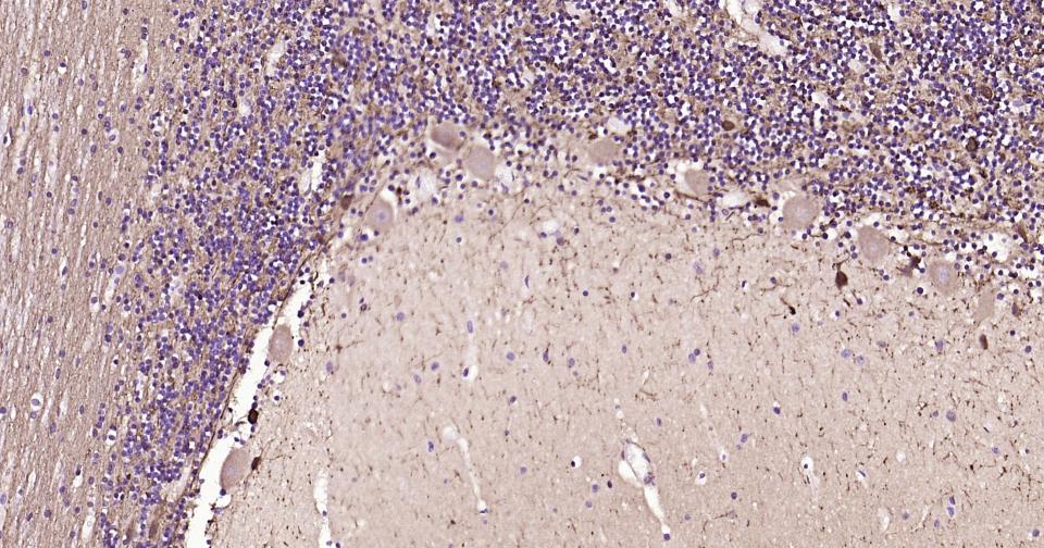Paraformaldehyde-fixed, paraffin embedded Rat Cerebellum; Antigen retrieval by boiling in sodium citrate buffer (pH6.0) for 15 min; Antibody incubation with Calretinin Monoclonal Antibody, Unconjugated(bsm-54076R) at 1:200 overnight at 4°C, followed by conjugation to the bs-0295G-HRP and DAB (C-0010) staining.