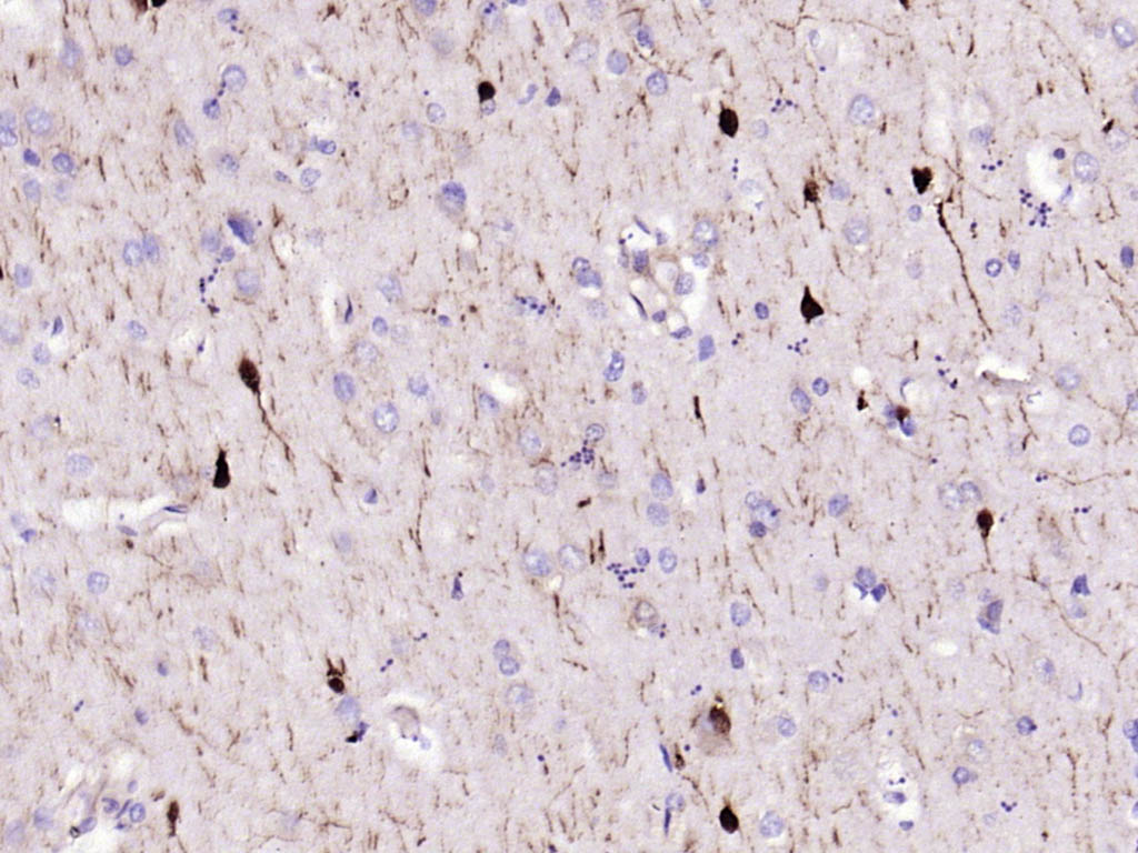 Paraformaldehyde-fixed, paraffin embedded (human brain ); Antigen retrieval by boiling in sodium citrate buffer (pH6.0) for 15min; Block endogenous peroxidase by 3% hydrogen peroxide for 20 minutes; Blocking buffer (normal goat serum) at 37°C for 30min; Antibody incubation with (Calretinin) Monoclonal Antibody, Unconjugated (bsm-54076R) at 1:200 overnight at 4°C, followed by operating according to SP Kit(Rabbit) (sp-0023) instructionsand DAB staining.