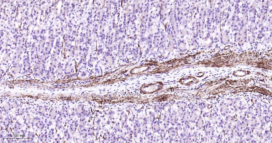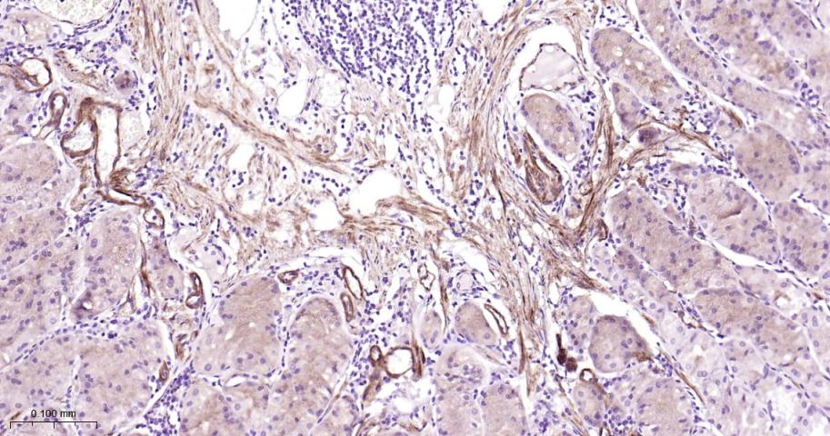 Paraformaldehyde-fixed, paraffin embedded Mouse Stomach; Antigen retrieval by boiling in sodium citrate buffer (pH6.0) for 15 min; Antibody incubation with Vinculin Monoclonal Antibody, Unconjugated(bsm-54148R) at 1:200 overnight at 4°C, followed by conjugation to the bs-0295G-HRP and DAB (C-0010) staining.