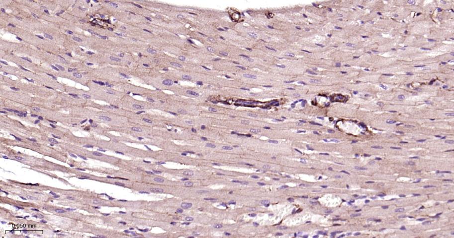 Paraformaldehyde-fixed, paraffin embedded Rat Heart; Antigen retrieval by boiling in sodium citrate buffer (pH6.0) for 15 min; Antibody incubation with Vinculin Monoclonal Antibody, Unconjugated(bsm-54148R) at 1:200 overnight at 4°C, followed by conjugation to the bs-0295G-HRP and DAB (C-0010) staining.