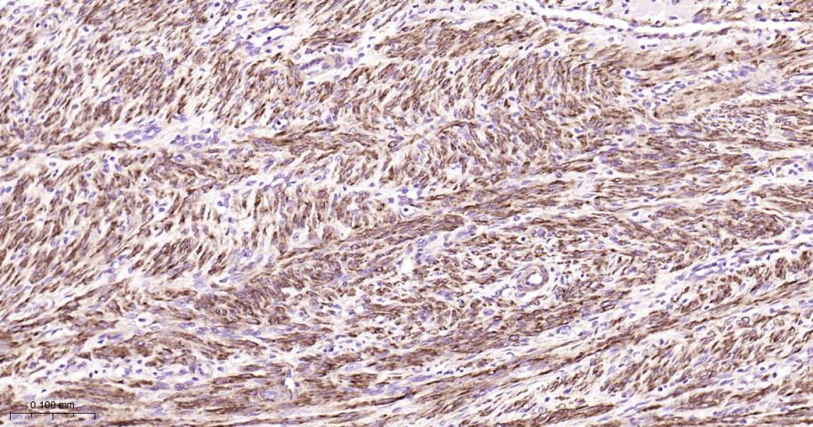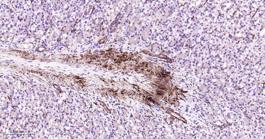 Paraformaldehyde-fixed, paraffin embedded Rat Stomach; Antigen retrieval by boiling in sodium citrate buffer (pH6.0) for 15 min; Antibody incubation with Vinculin Monoclonal Antibody, Unconjugated(bsm-54148R) at 1:200 overnight at 4°C, followed by conjugation to the bs-0295G-HRP and DAB (C-0010) staining.
