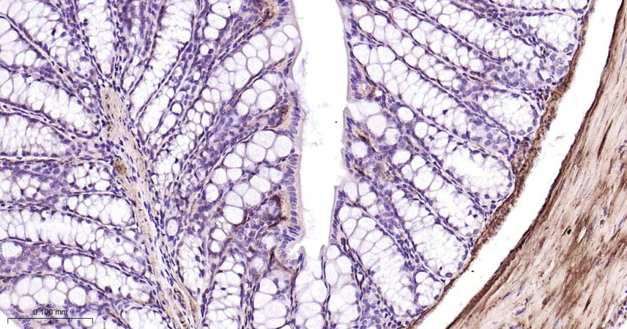 Paraformaldehyde-fixed, paraffin embedded Mouse Colon; Antigen retrieval by boiling in sodium citrate buffer (pH6.0) for 15 min; Antibody incubation with Vinculin Monoclonal Antibody, Unconjugated(bsm-54148R) at 1:200 overnight at 4°C, followed by conjugation to the bs-0295G-HRP and DAB (C-0010) staining.