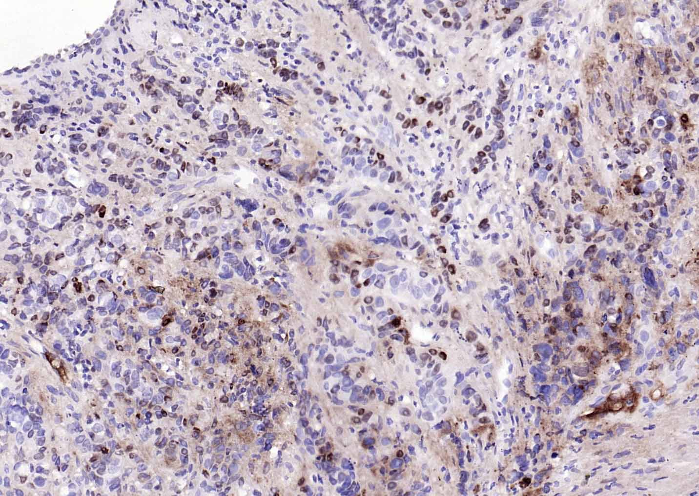 Paraformaldehyde-fixed, paraffin embedded (human breast carcinoma); Antigen retrieval by boiling in sodium citrate buffer (pH6.0) for 15min; Block endogenous peroxidase by 3% hydrogen peroxide for 20 minutes; Blocking buffer (normal goat serum) at 37°C for 30min; Antibody incubation with (BST2) Monoclonal Antibody, Unconjugated (bsm-54196R) at 1:200 overnight at 4°C, followed by operating according to SP Kit(Rabbit) (sp-0023) instructionsand DAB staining.