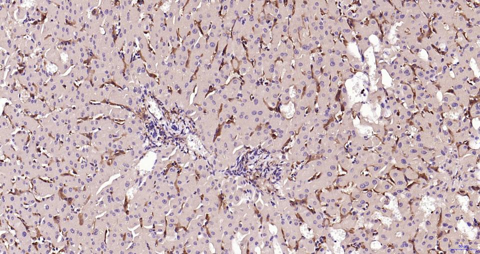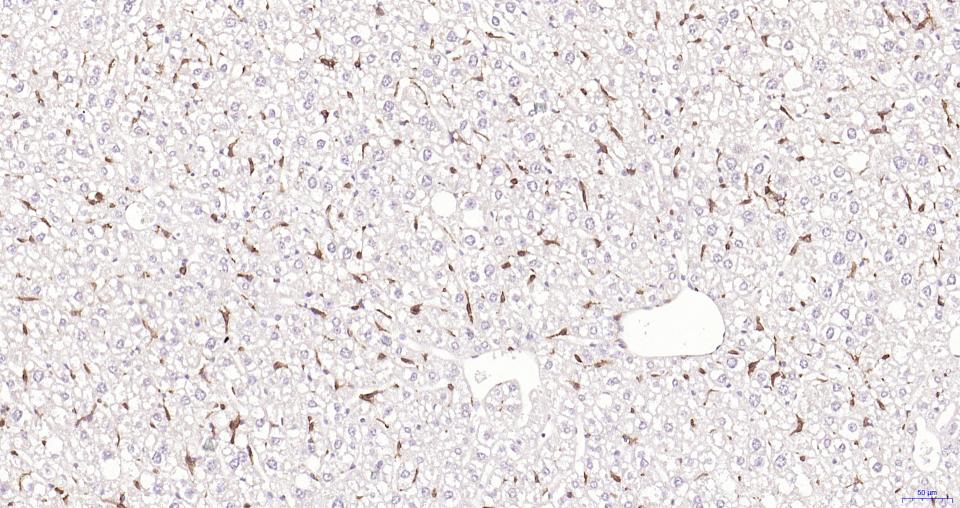 Paraformaldehyde-fixed, paraffin embedded Rat Liver; Antigen retrieval by boiling in sodium citrate buffer (pH6.0) for 15 min; Antibody incubation with AIF1 (9A3) Monoclonal Antibody, Unconjugated(bsm-54132R) at 1:200 overnight at 4°C, followed by conjugation to the SP Kit(Rabbit, SP-0023) and DAB (C-0010) staining.