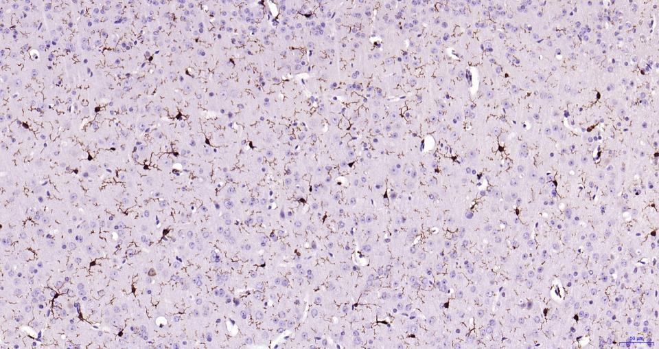 Paraformaldehyde-fixed, paraffin embedded Mouse Cerebrum; Antigen retrieval by boiling in sodium citrate buffer (pH6.0) for 15 min; Antibody incubation with AIF1 (9A3) Monoclonal Antibody, Unconjugated(bsm-54132R) at 1:200 overnight at 4°C, followed by conjugation to the SP Kit(Rabbit, SP-0023) and DAB (C-0010) staining.