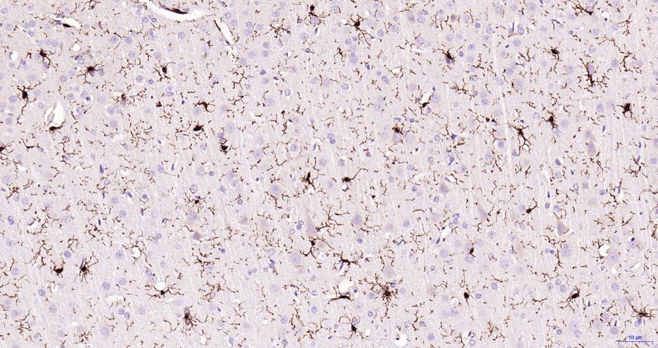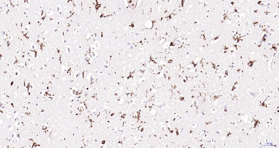 Paraformaldehyde-fixed, paraffin embedded Human Left Parietal Lobe; Antigen retrieval by boiling in sodium citrate buffer (pH6.0) for 15 min; Antibody incubation with AIF1 (9A3) Monoclonal Antibody, Unconjugated(bsm-54132R) at 1:200 overnight at 4°C, followed by conjugation to the SP Kit(Rabbit, SP-0023) and DAB (C-0010) staining.
