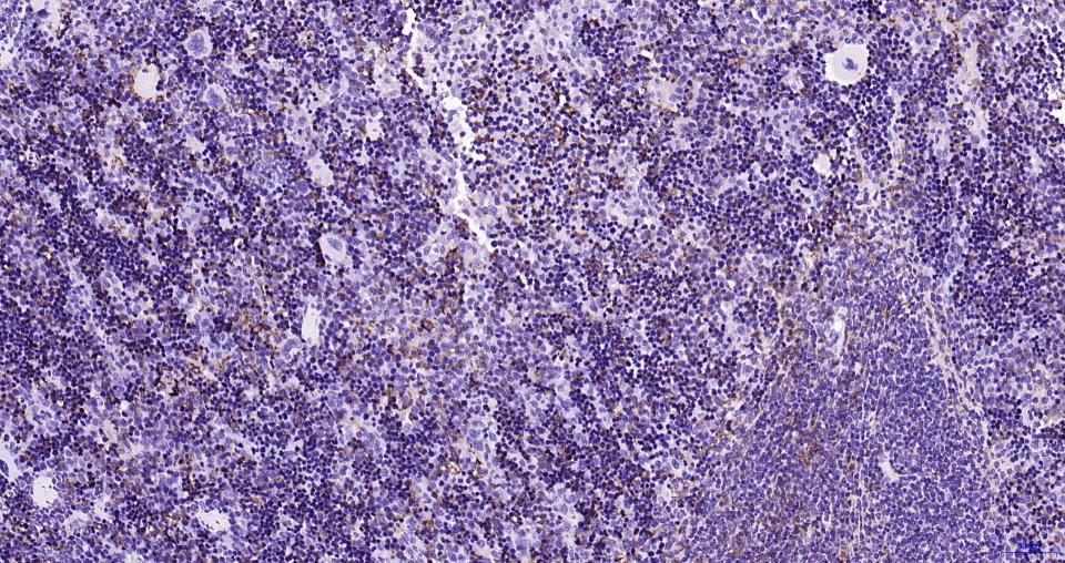 Paraformaldehyde-fixed, paraffin embedded Human Spleen; Antigen retrieval by boiling in sodium citrate buffer (pH6.0) for 15 min; Antibody incubation with AIF1 (9A3) Monoclonal Antibody, Unconjugated(bsm-54132R) at 1:200 overnight at 4°C, followed by conjugation to the SP Kit(Rabbit, SP-0023) and DAB (C-0010) staining.