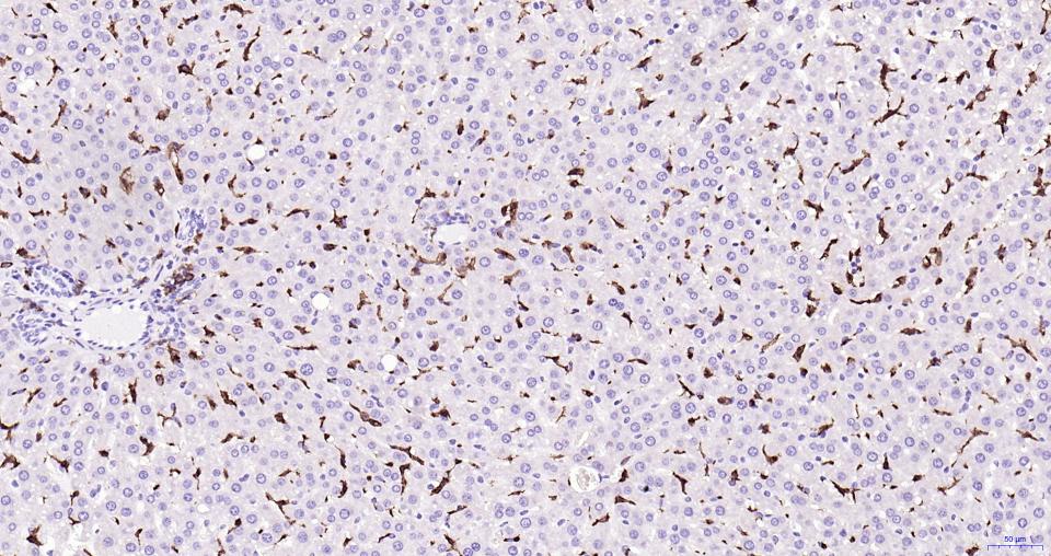Paraformaldehyde-fixed, paraffin embedded Mouse Liver; Antigen retrieval by boiling in sodium citrate buffer (pH6.0) for 15 min; Antibody incubation with AIF1 (9A3) Monoclonal Antibody, Unconjugated(bsm-54132R) at 1:200 overnight at 4°C, followed by conjugation to the SP Kit(Rabbit, SP-0023) and DAB (C-0010) staining.