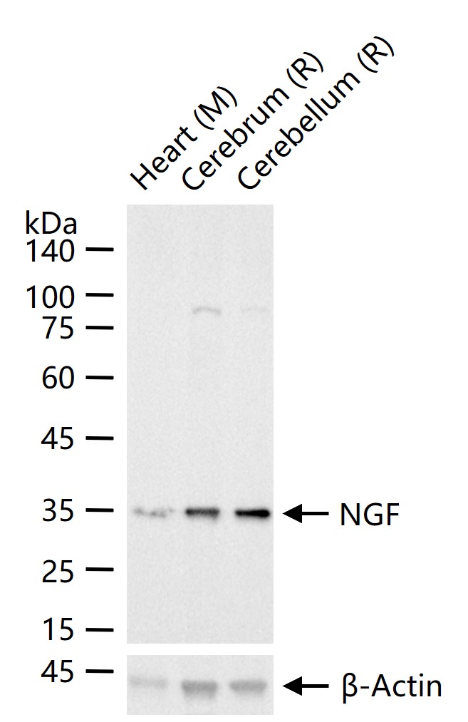 25 ug total protein per lane of various lysates (see on figure) probed with NGF monoclonal antibody, unconjugated (bsm-52362R) at 1:1000 dilution and 4°C overnight incubation. Followed by conjugated secondary antibody incubation at r.t. for 60 min.