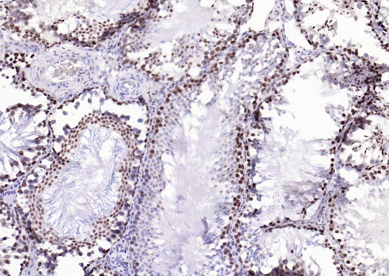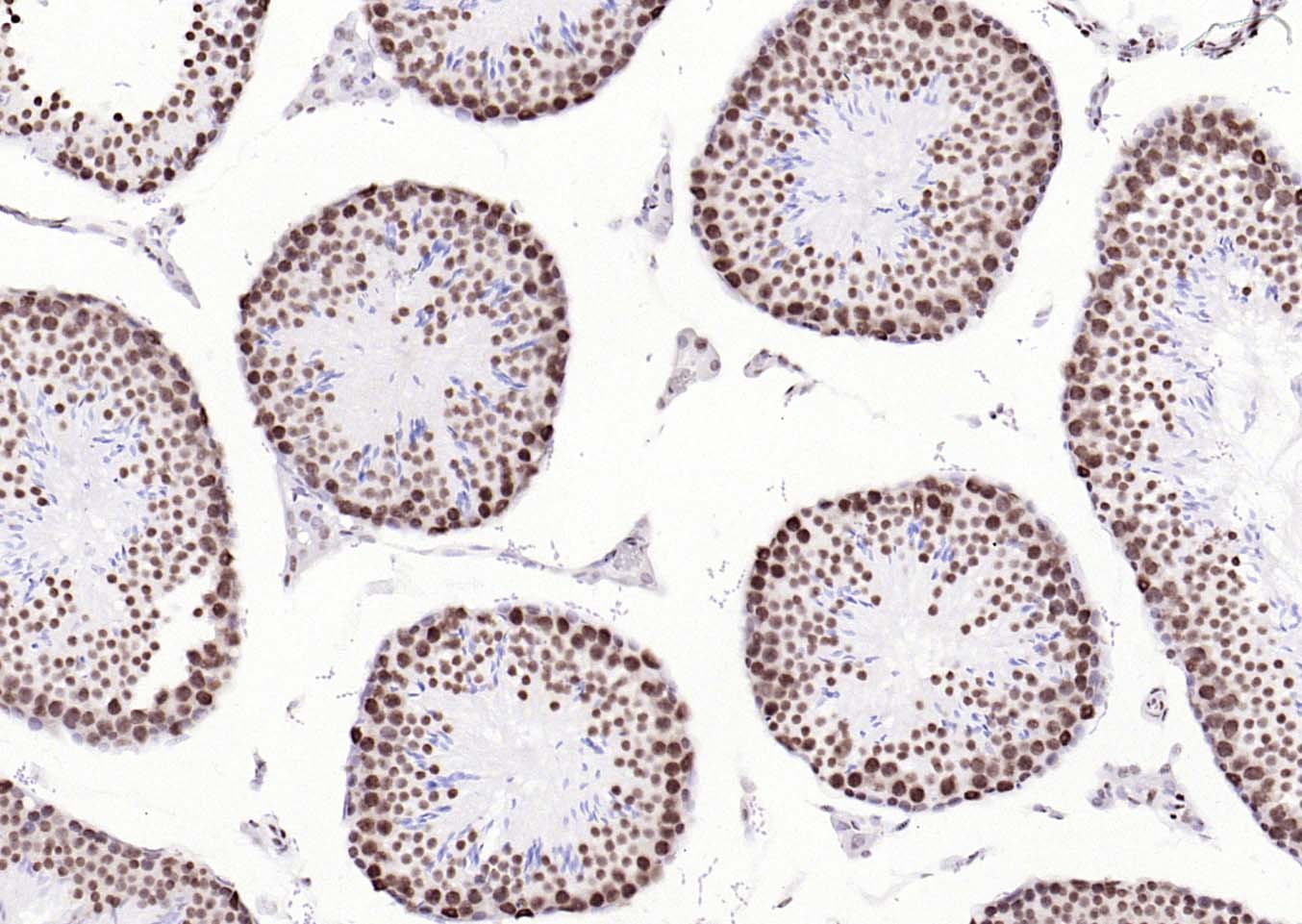 Paraformaldehyde-fixed, paraffin embedded (rat testis); Antigen retrieval by boiling in sodium citrate buffer (pH6.0) for 15min; Block endogenous peroxidase by 3% hydrogen peroxide for 20 minutes; Blocking buffer (normal goat serum) at 37°C for 30min; Antibody incubation with (Bub3) Monoclonal Antibody, Unconjugated (bsm-54413R) at 1:200 overnight at 4°C, followed by operating according to SP Kit(Rabbit) (sp-0023) instructionsand DAB staining.