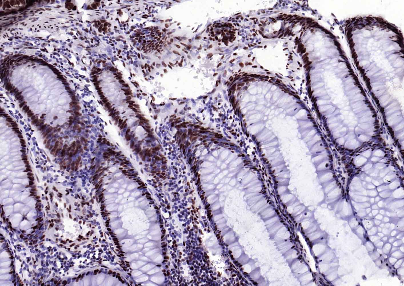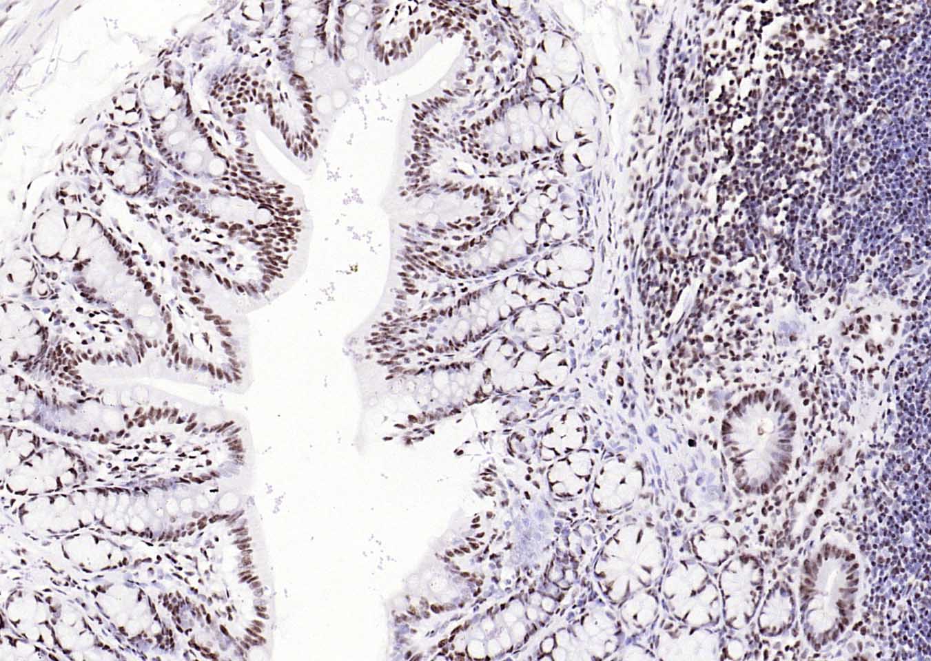 Paraformaldehyde-fixed, paraffin embedded (rat colon); Antigen retrieval by boiling in sodium citrate buffer (pH6.0) for 15min; Block endogenous peroxidase by 3% hydrogen peroxide for 20 minutes; Blocking buffer (normal goat serum) at 37°C for 30min; Antibody incubation with (Bub3) Monoclonal Antibody, Unconjugated (bsm-54413R) at 1:200 overnight at 4°C, followed by operating according to SP Kit(Rabbit) (sp-0023) instructionsand DAB staining.