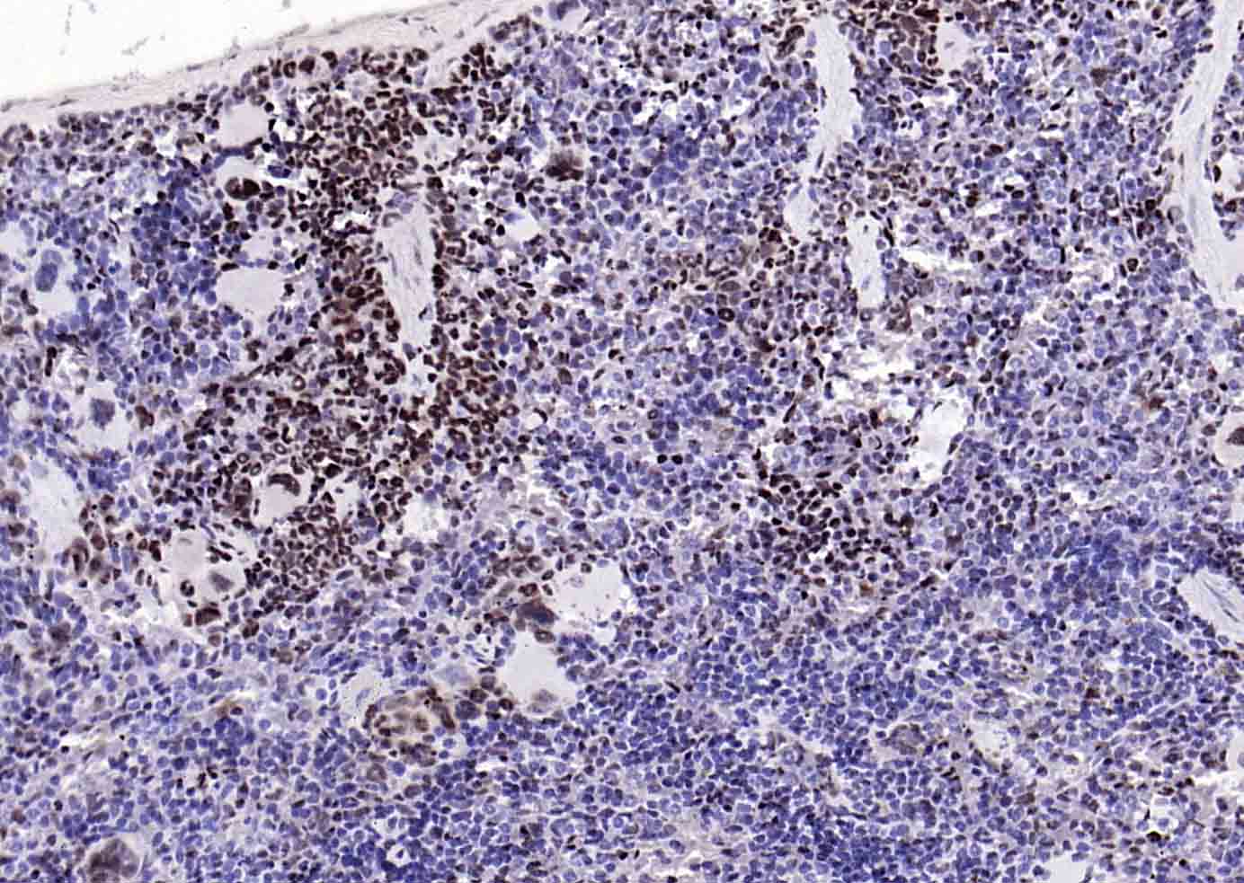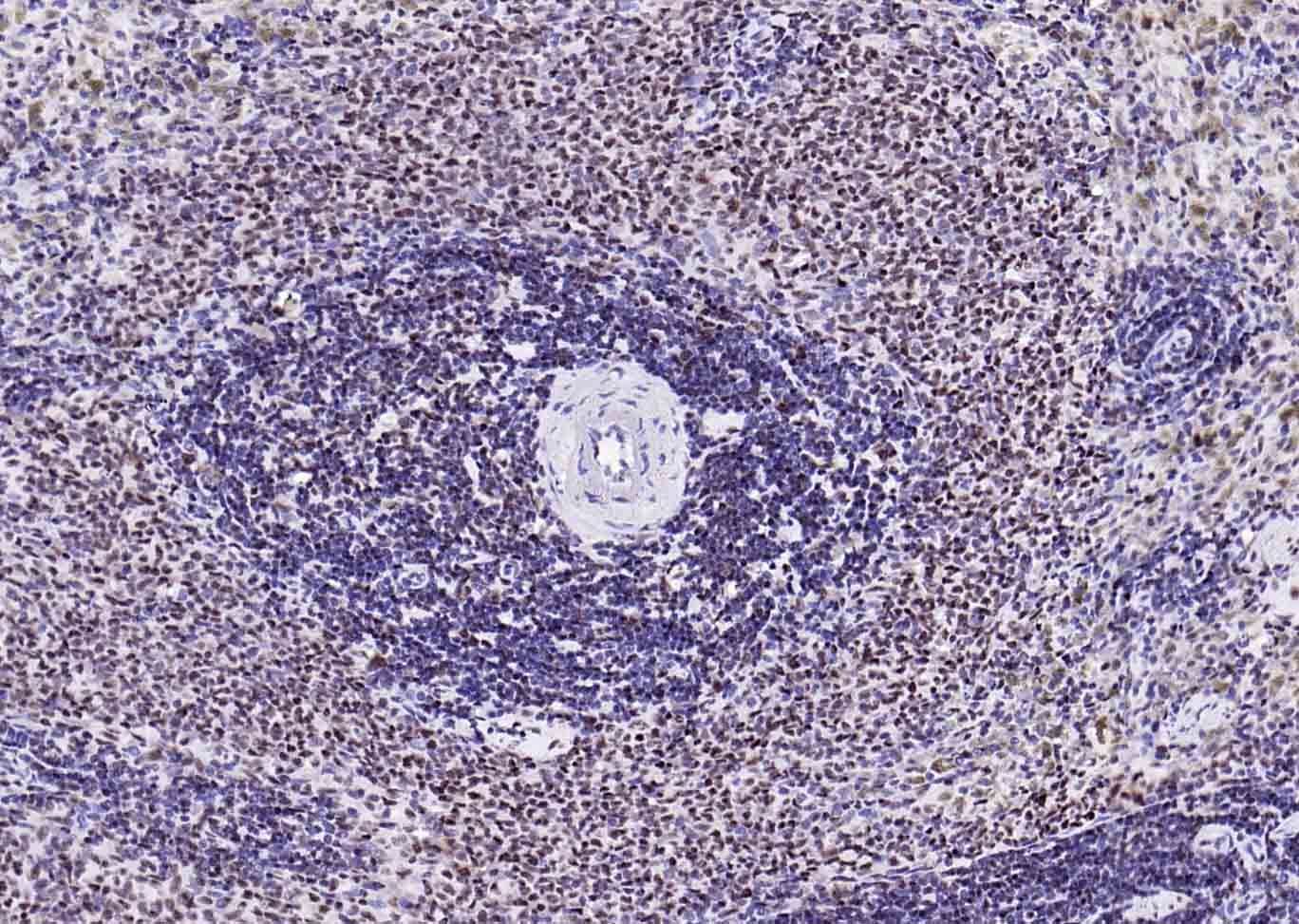 Paraformaldehyde-fixed, paraffin embedded (rat spleen); Antigen retrieval by boiling in sodium citrate buffer (pH6.0) for 15min; Block endogenous peroxidase by 3% hydrogen peroxide for 20 minutes; Blocking buffer (normal goat serum) at 37°C for 30min; Antibody incubation with (Bub3) Monoclonal Antibody, Unconjugated (bsm-54413R) at 1:200 overnight at 4°C, followed by operating according to SP Kit(Rabbit) (sp-0023) instructionsand DAB staining.