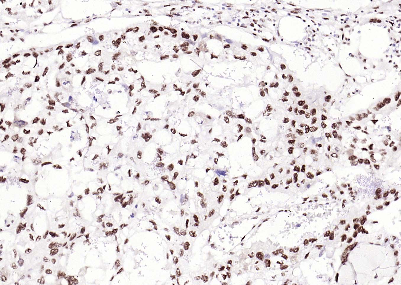 Paraformaldehyde-fixed, paraffin embedded (human breast carcinoma); Antigen retrieval by boiling in sodium citrate buffer (pH6.0) for 15min; Block endogenous peroxidase by 3% hydrogen peroxide for 20 minutes; Blocking buffer (normal goat serum) at 37°C for 30min; Antibody incubation with (Bub3) Monoclonal Antibody, Unconjugated (bsm-54413R) at 1:200 overnight at 4°C, followed by operating according to SP Kit(Rabbit) (sp-0023) instructionsand DAB staining.