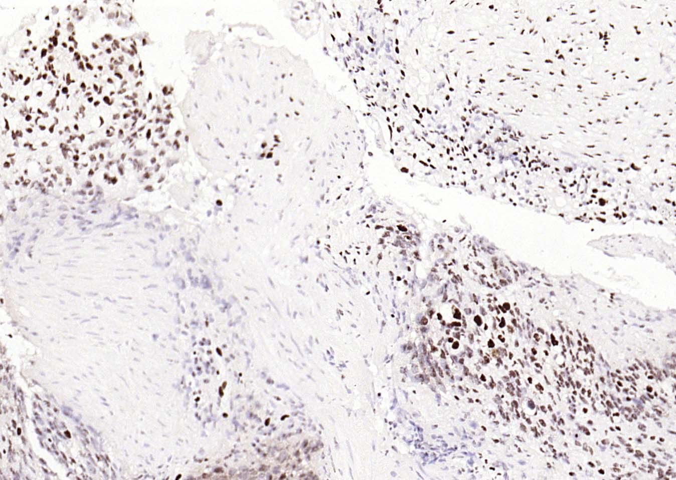 Paraformaldehyde-fixed, paraffin embedded (human skin cancer); Antigen retrieval by boiling in sodium citrate buffer (pH6.0) for 15min; Block endogenous peroxidase by 3% hydrogen peroxide for 20 minutes; Blocking buffer (normal goat serum) at 37°C for 30min; Antibody incubation with (Bub3) Monoclonal Antibody, Unconjugated (bsm-54413R) at 1:200 overnight at 4°C, followed by operating according to SP Kit(Rabbit) (sp-0023) instructionsand DAB staining.
