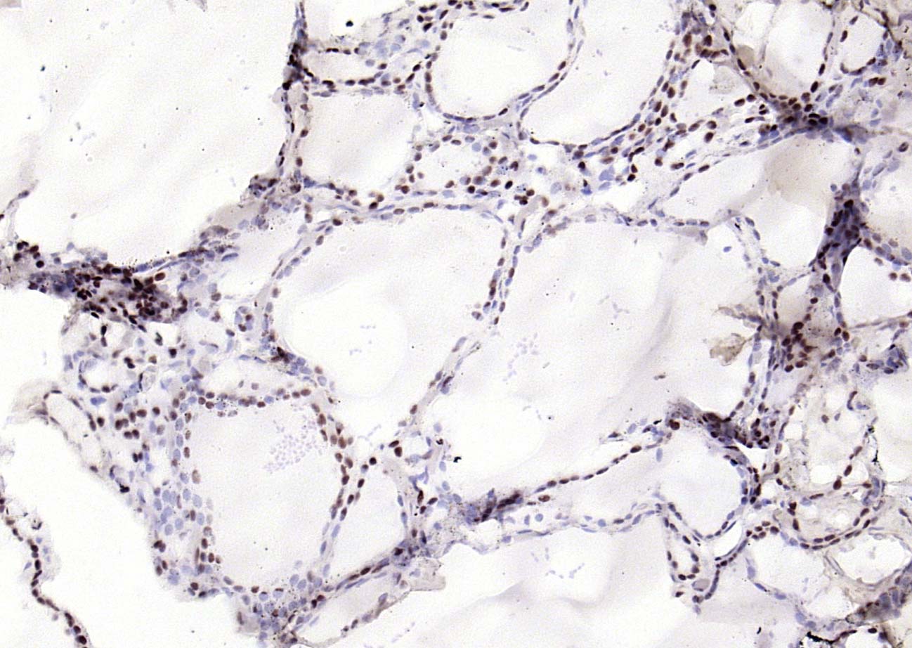 Paraformaldehyde-fixed, paraffin embedded (human thyroid gland); Antigen retrieval by boiling in sodium citrate buffer (pH6.0) for 15min; Block endogenous peroxidase by 3% hydrogen peroxide for 20 minutes; Blocking buffer (normal goat serum) at 37°C for 30min; Antibody incubation with (Bub3) Monoclonal Antibody, Unconjugated (bsm-54413R) at 1:200 overnight at 4°C, followed by operating according to SP Kit(Rabbit) (sp-0023) instructionsand DAB staining.