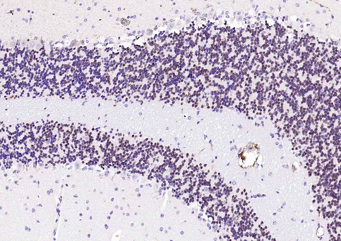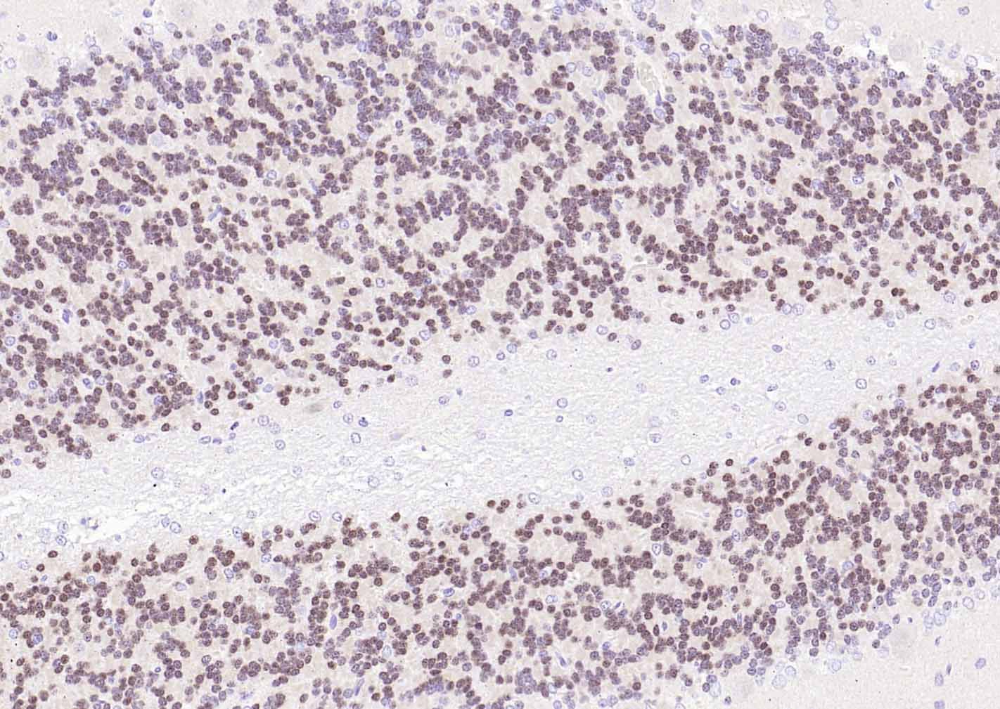 Paraformaldehyde-fixed, paraffin embedded (rat cerebellum ); Antigen retrieval by boiling in sodium citrate buffer (pH6.0) for 15min; Block endogenous peroxidase by 3% hydrogen peroxide for 20 minutes; Blocking buffer (normal goat serum) at 37°C for 30min; Incubation with (NeuN) Monoclonal Antibody, Unconjugated (bsm-41402M) at 1:100 overnight at 4°C, followed by operating according to SP Kit(Mouse)(sp-0024) instructionsand DAB staining.