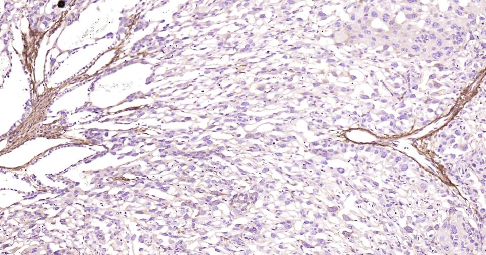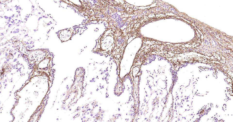 Paraformaldehyde-fixed, paraffin embedded Mouse Placenta; Antigen retrieval by boiling in sodium citrate buffer (pH6.0) for 15 min; Antibody incubation with Lumican Monoclonal Antibody, Unconjugated(bsm-54450R) at 1:150 overnight at 4°C, followed by conjugation to the bs-0295G-HRP and DAB (C-0010) staining.