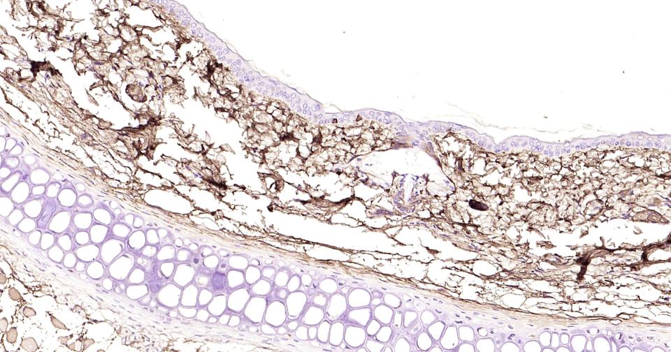 Paraformaldehyde-fixed, paraffin embedded Mouse Skin; Antigen retrieval by boiling in sodium citrate buffer (pH6.0) for 15 min; Antibody incubation with Lumican Monoclonal Antibody, Unconjugated(bsm-54450R) at 1:150 overnight at 4°C, followed by conjugation to the bs-0295G-HRP and DAB (C-0010) staining.