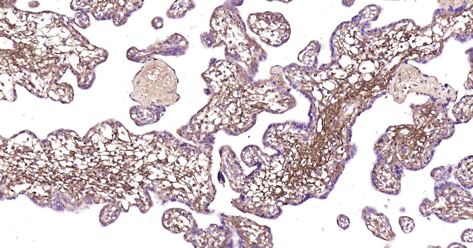 Paraformaldehyde-fixed, paraffin embedded Human Placenta; Antigen retrieval by boiling in sodium citrate buffer (pH6.0) for 15 min; Antibody incubation with Lumican Monoclonal Antibody, Unconjugated(bsm-54450R) at 1:150 overnight at 4°C, followed by conjugation to the bs-0295G-HRP and DAB (C-0010) staining.