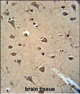 Paraformaldehyde-fixed, paraffin embedded (human brain ); Antigen retrieval by boiling in sodium citrate buffer (pH6.0) for 15min; Block endogenous peroxidase by 3% hydrogen peroxide for 20 minutes; Blocking buffer (normal goat serum) at 37°C for 30min; Antibody incubation with (ALDH2 ) Monoclonal Antibody, Unconjugated (bsm-51466M) at 1:200 overnight at 4°C, followed by operating according to SP Kit(Mouse)(sp-0024) instructionsand DAB staining.