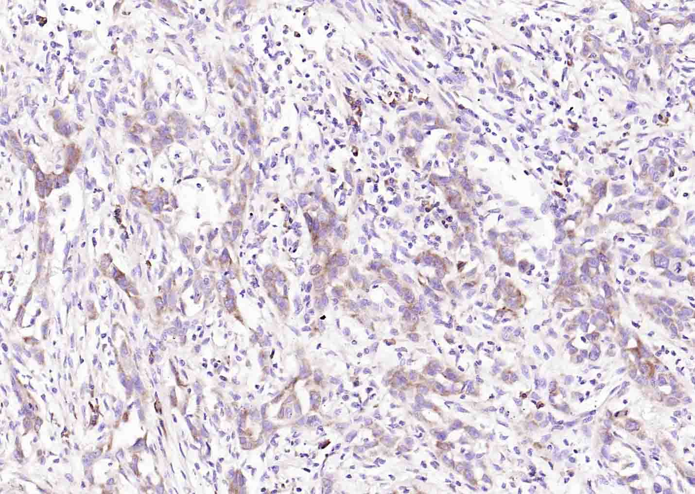Paraformaldehyde-fixed, paraffin embedded (human gastric carcinoma); Antigen retrieval by boiling in sodium citrate buffer (pH6.0) for 15min; Block endogenous peroxidase by 3% hydrogen peroxide for 20 minutes; Blocking buffer (normal goat serum) at 37°C for 30min; Incubation with (MMP2) Monoclonal Antibody, Unconjugated (bsm-51472M) at 1:200 overnight at 4°C, followed by operating according to SP Kit(Mouse)(sp-0024) instructionsand DAB staining.