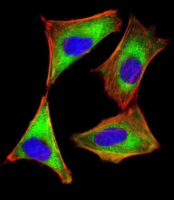 Hela cell; 4% Paraformaldehyde-fixed; Triton X-100 at room temperature for 20 min; Blocking buffer (normal goat serum) at 37°C for 20 min; Antibody incubation with (EIF2AK2) monoclonal Antibody, Unconjugated (bsm-51601M) 1:25, 90 minutes at 37°C; followed by a conjugated Goat Anti-Mouse IgG antibody at 37°C for 90 minutes, Alexa Fluor? 555 conjugated with Phalloidin(red) was used to stain the cell Cytoplasmic actin.The nuclear counter stain is DAPI (blue)