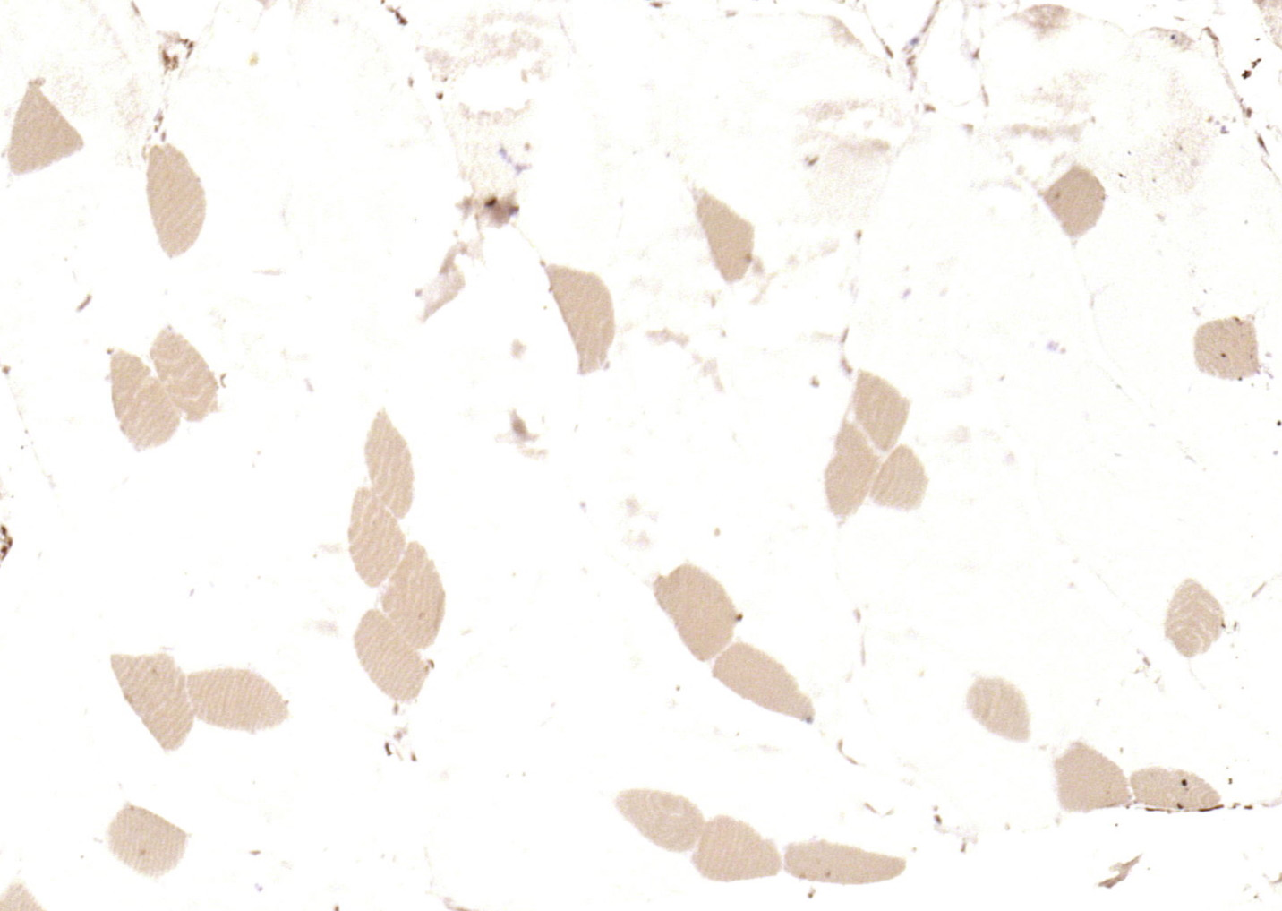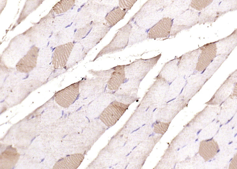 Paraformaldehyde-fixed, paraffin embedded (mouse skeletal muscle); Antigen retrieval by boiling in sodium citrate buffer (pH6.0) for 15min; Block endogenous peroxidase by 3% hydrogen peroxide for 20 minutes; Blocking buffer (normal goat serum) at 37°C for 30min; Antibody incubation with (MYH7) Polyclonal Antibody, Unconjugated (bs-24941R) at 1:200 overnight at 4°C, followed by operating according to SP Kit(Rabbit) (sp-0023) instructionsand DAB staining.
