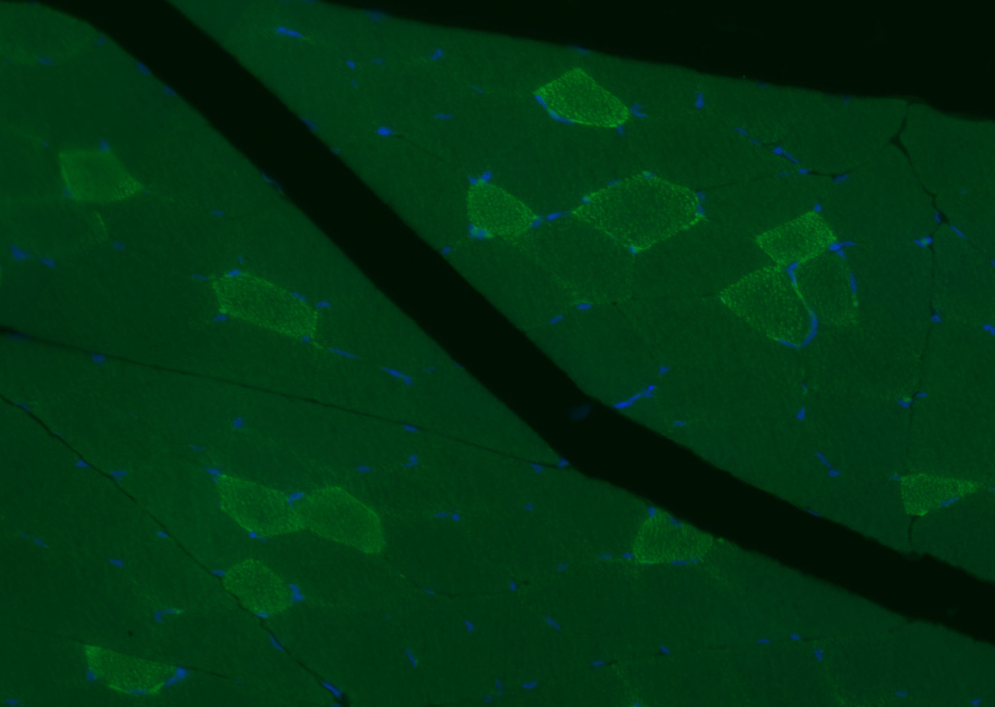 Paraformaldehyde-fixed, paraffin embedded (rat skeletal muscle); Antigen retrieval by boiling in sodium citrate buffer (pH6.0) for 15min; Blocking buffer (normal goat serum) at 37°C for 30min; Antibody incubation with (MYH7) Polyclonal Antibody, Unconjugated (bs-20941R) at 1:200 overnight at 4°C, followed by a conjugated Goat Anti-Rabbit IgG antibody (bs-0295G-FITC) for 90 minutes, and DAPI for nuclei staining.